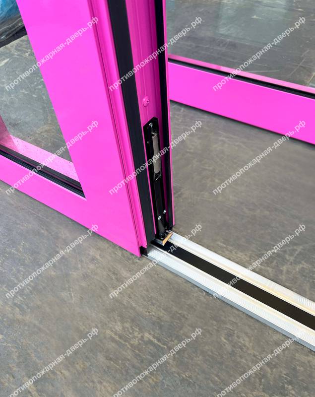 Остекленная дверь с пределом огнестойкости EIW 60 изготовлена из алюминиевого профиля с использованием огнеупорных стеклопакетов большой площади. Металлические элементы конструкции окрашены порошковым напылением по RAL в ярко-розовый цвет.